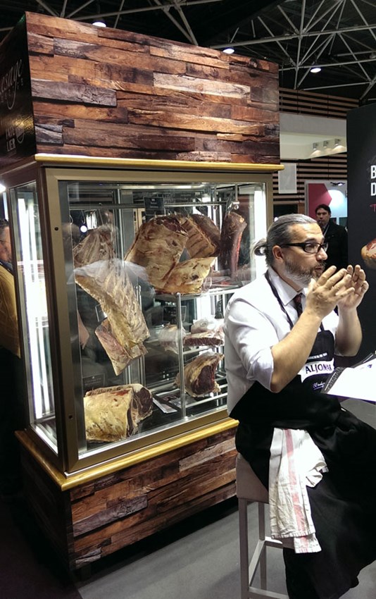 Transparante Dry Age kast met betegeling, afgewerkt met hout en verlichte letters.